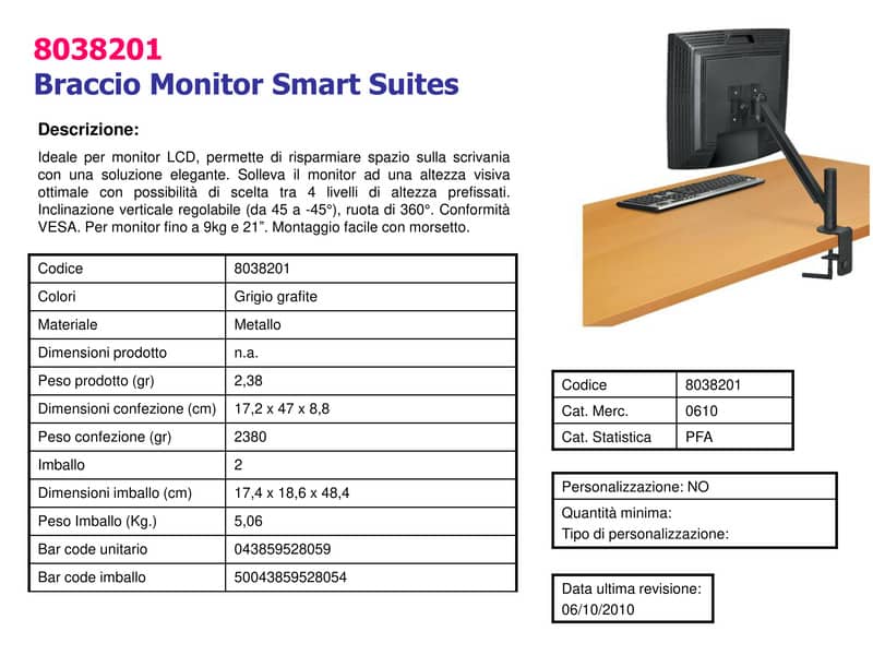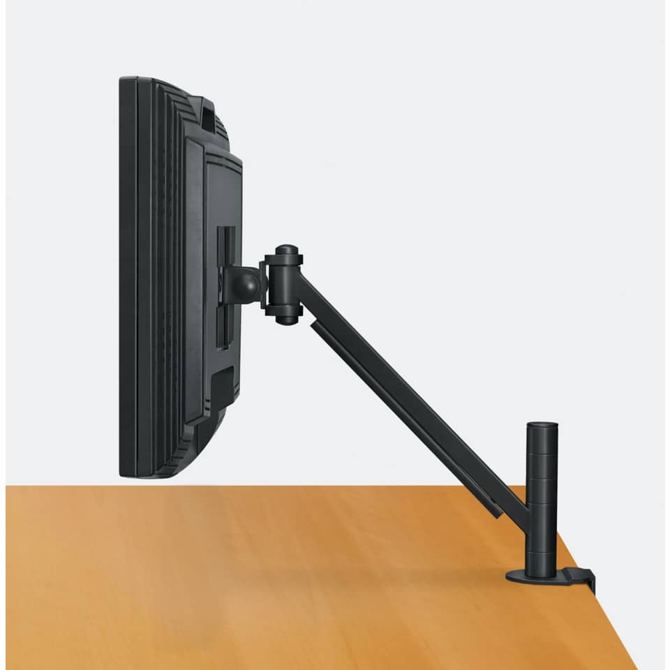 Braccio Monitor Singolo per regolare monitor LCD/TFT all'altezza einclinazione più comoda. Supporto Monitor fino ad un max di 21 pollici.Ruota di 360°, inclinazione fino a 180°, scorrimento+/- 45°.Altezza regolabile in 5 posizioni fisse, fino a 10 cm di libertà di regolazione.Massima estensione 36,8 cm, massima altezza 11,4 cm.Comformità VESA-75x75 e 100x100