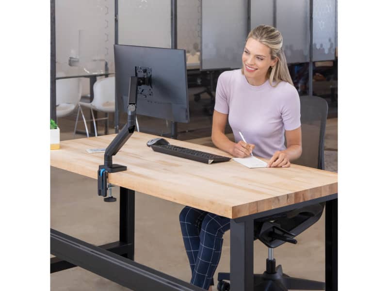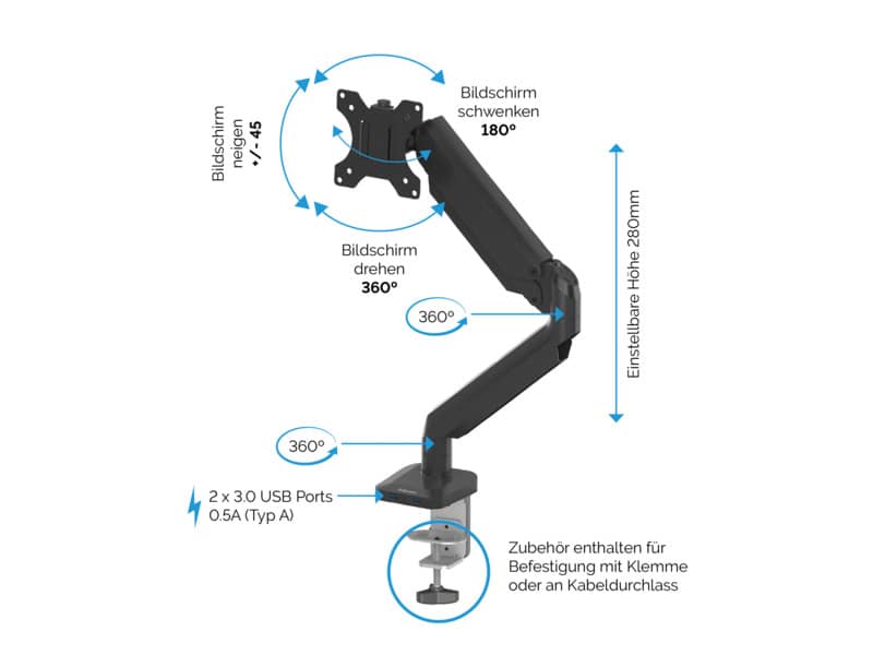 Braccio Monitor Singolo per regolare monitor LCD/TFT all'altezza einclinazione più comoda. Supporto Monitor fino ad un max di 30 pollici.Ruota di 360°, inclinazione 180°, scorrimento+85°/- 15°°.Altezza regolabile da 8 cm a 41,9 cm.Comformità VESA-75x75 e 100x100.Intuitivo sistema ordinacavi.Montaggio a morsa o tramite foro e ganascia.2 porte USB.